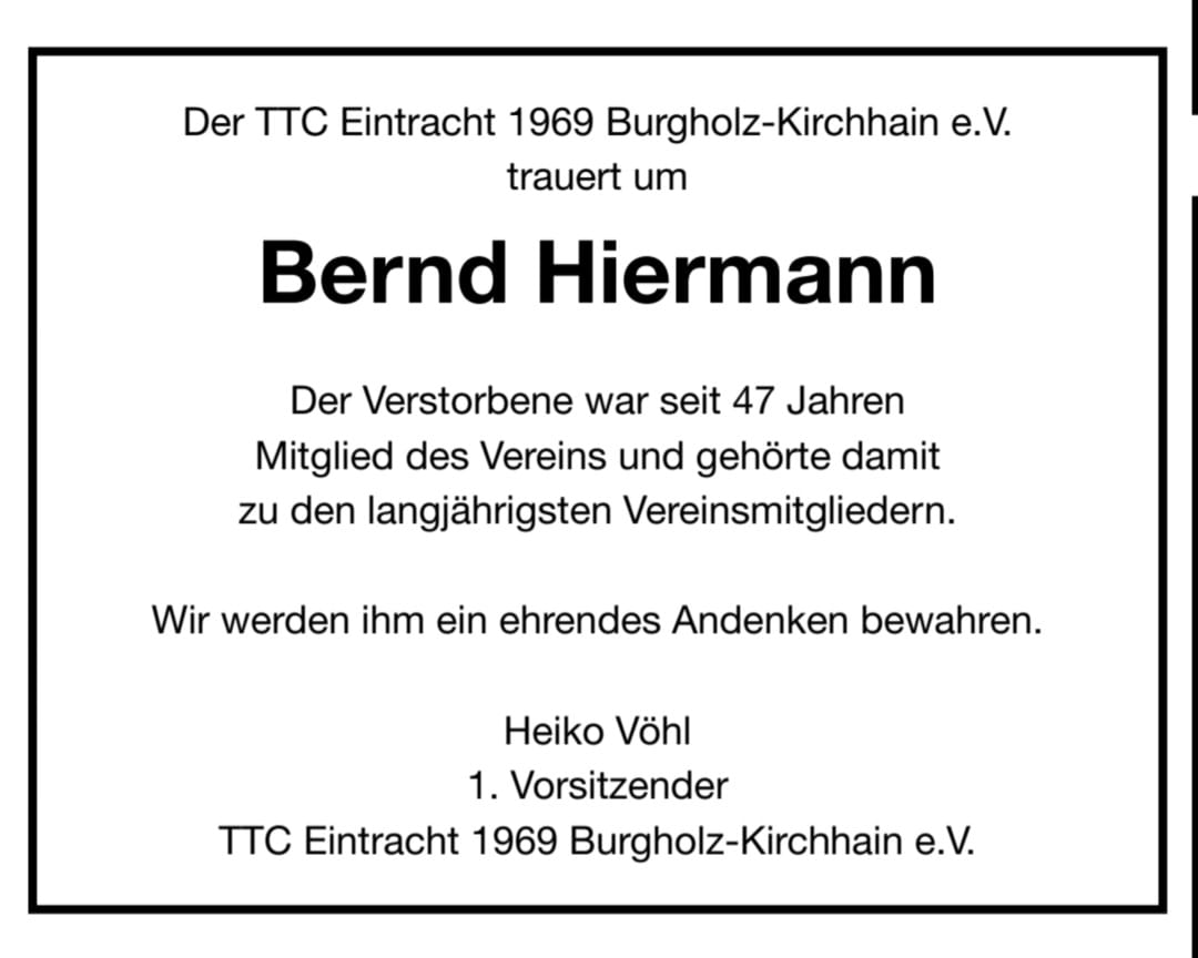 Der TTC Eintracht 1969 Burgholz-Kirchhain e.V. hat Wolfgang sehr viel zu verdanken. Unser Mitgefühl in dieser traurigen Zeit gilt seiner lieben Ehefrau Hilde und den Kindern Petra und Claudia.