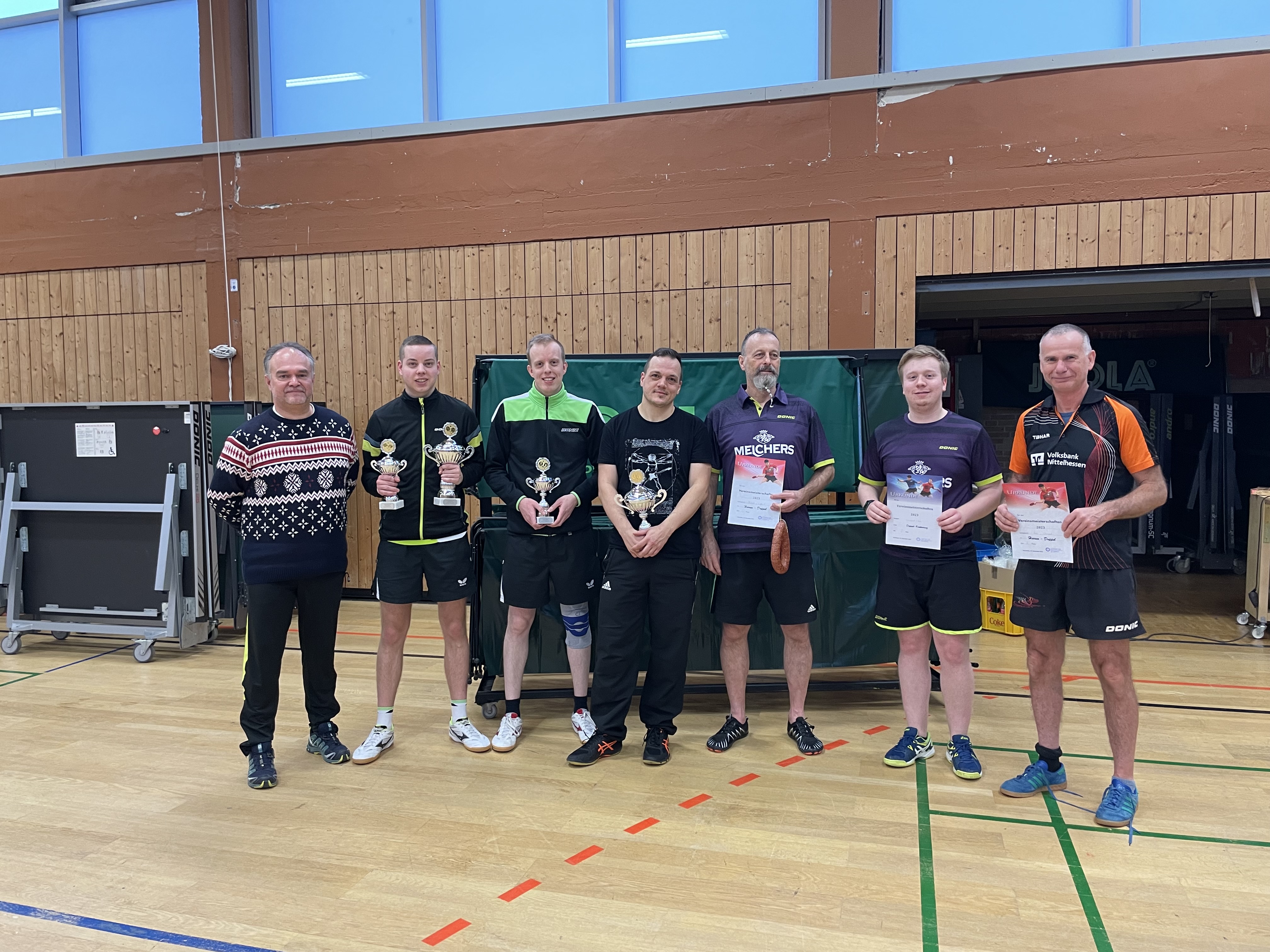 Die Sieger der Vereinsmeisterschaften 2023 (von rechts nach links): Jürgen Hoos 4. Einzel u. 2. Doppel, Alexander Weinand 2. Doppel, Bernd Bartsch 3. Doppel, Martin Rhiel 2. Einzel, Daniel Ziegner Sieger Doppel, Lars Rüffer Sieger Einzel und Doppel, Heiko Vöhl 1. Vorsitzender)